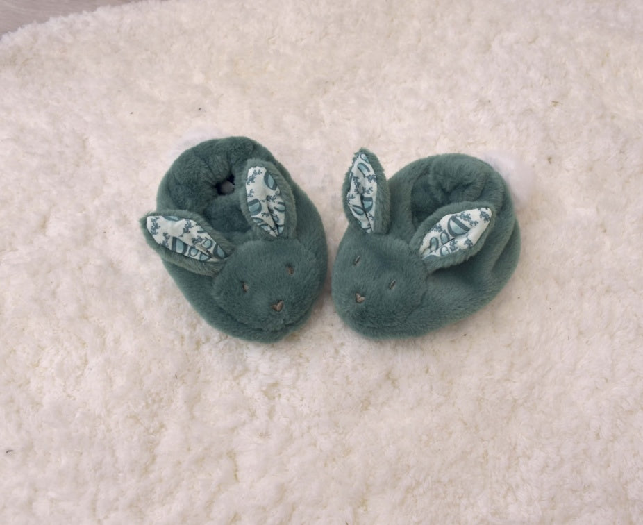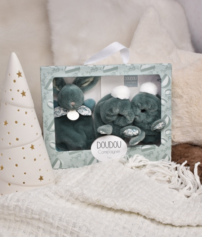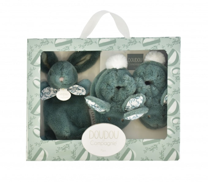 Hop into parenthood with this delightful gift set! This adorable duo pairs a touchably soft sage green bunny with matching baby booties, creating the ultimate newborn welcome package.