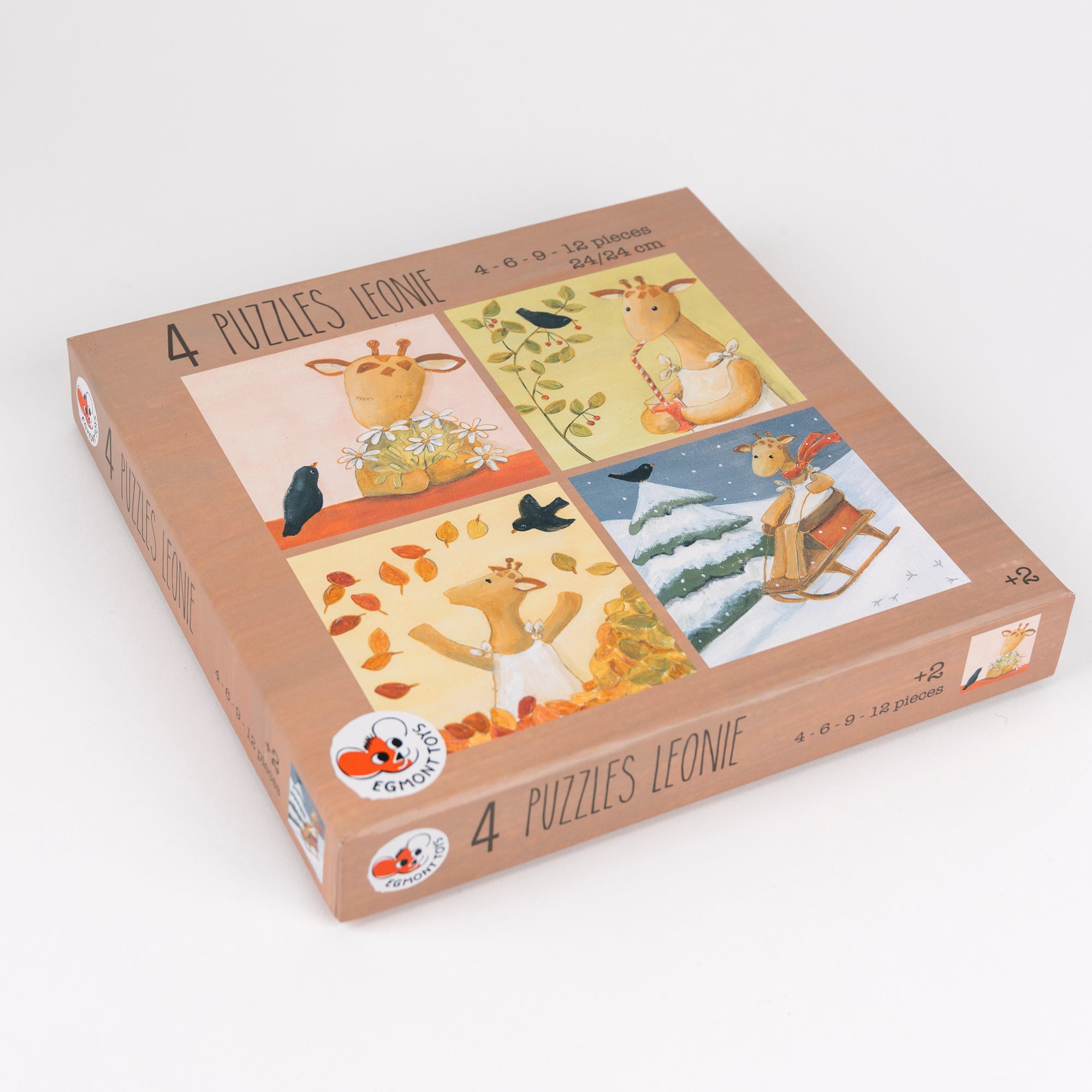 Join Léonie the giraffe on his fun-filled adventures with this set of four colorful puzzles! Featuring 4, 6, 9, and 12 pieces, each puzzle offers just the right challenge for little hands to build confidence and develop problem-solving skills. Perfect for playtime, these puzzles bring Léonie'sjourney through the seasons to life in a playful way that sparks imagination and joy.