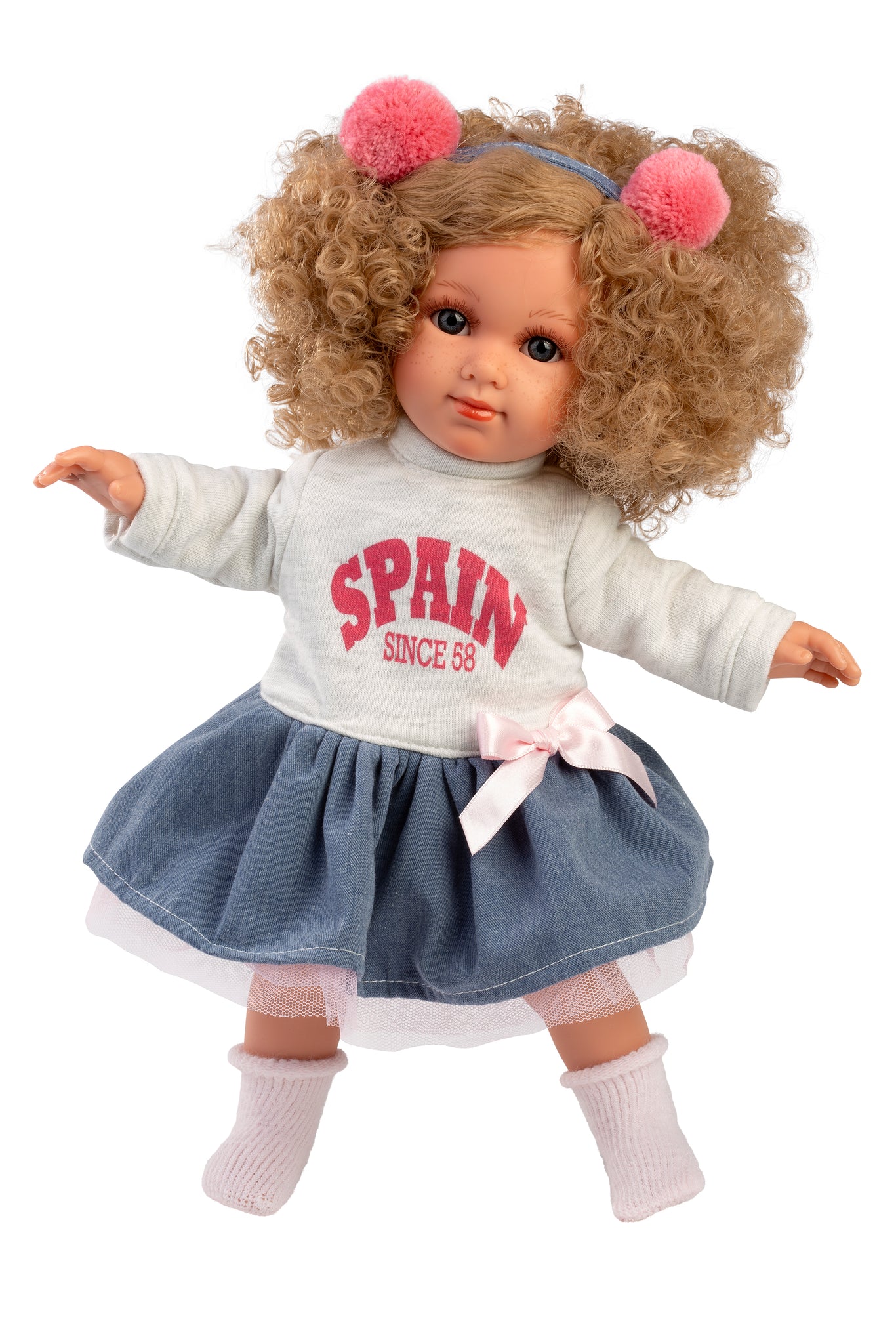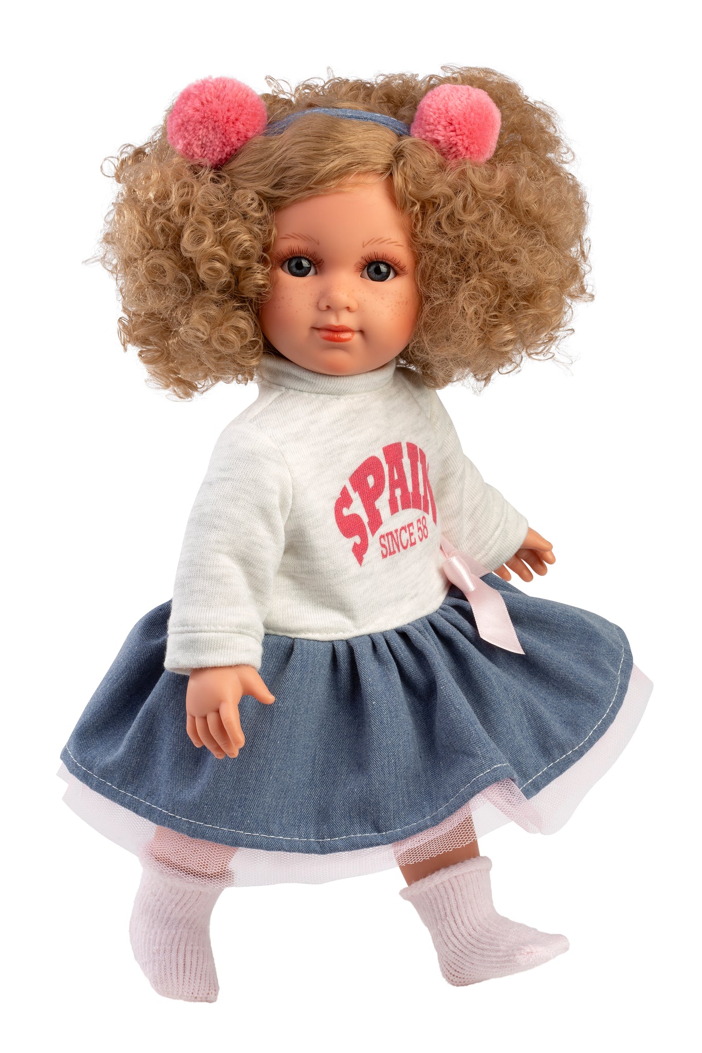 Melanie, the 13.8" soft body fashion doll, is dressed in her vibrant "Spain" dress, ready to brighten up any playtime. Her curly blonde hair is accented with a playful headband decorated with colorful pompoms, adding a fun and festive touch to her charming style. Perfect for inspiring joyful adventures!