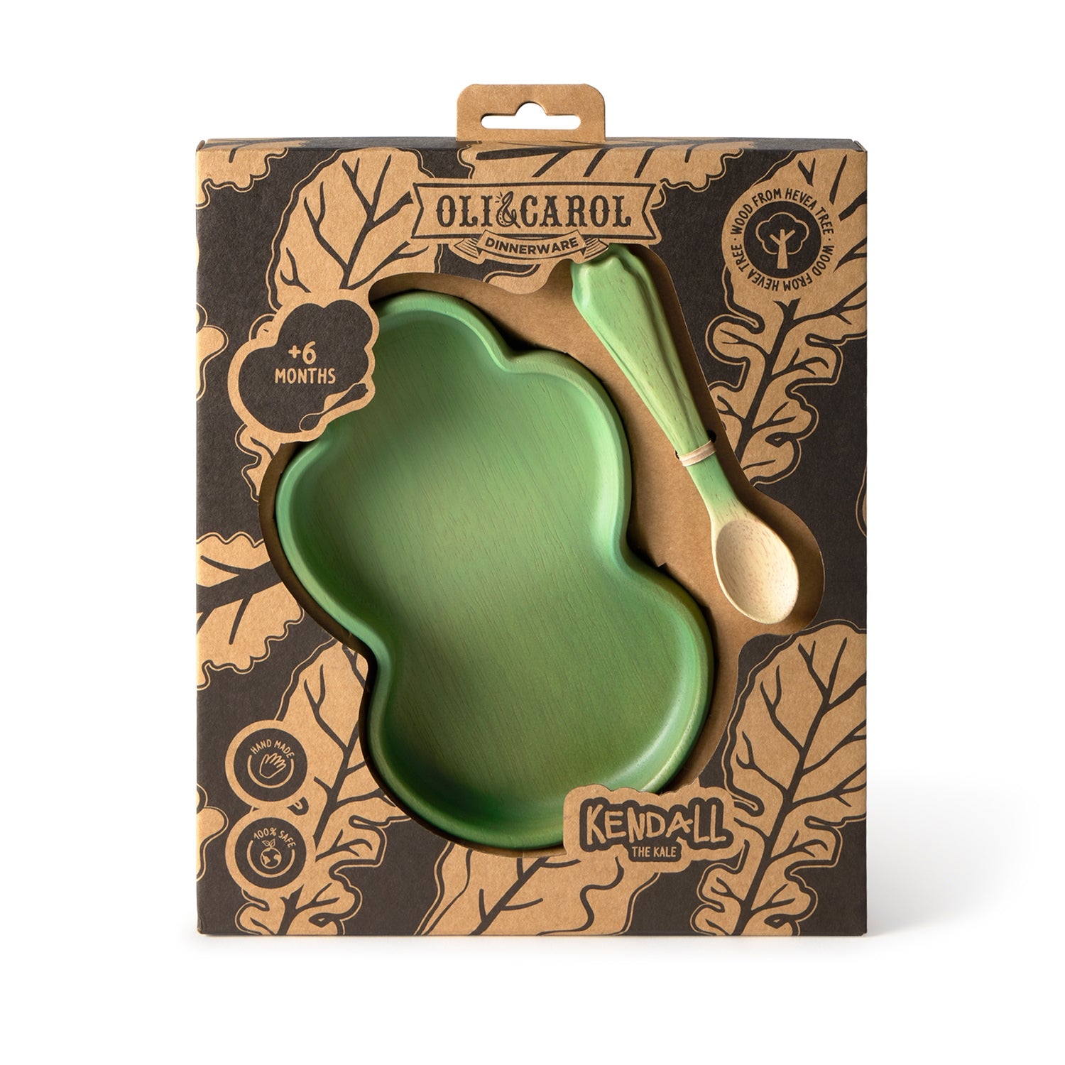 Kendall the Kale Dinnerware is the coolest baby tableware set at the table. The set comes with a plate and spoon, handcrafted from Hevea wood—giving a second life to the trees that once made our rubber toys. A safer choice for little ones: phthalate-free, non-toxic & made with love.