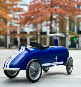 But beyond a children's toy, this Ford Mustang ride-on is a decorative item that will be a hit! We've taken special care with this model: the chrome steering wheel, the black seat, the hubcaps with two beautiful shades of gray, the word "Mustang" written on the rocker panel, the gas cap, and that blue! Have you seen that incredible blue? It's sure to catch everyone's eye.