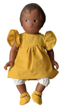 Alicia, this beautiful doll, looks as if she just came out of a fairy tale. With her vintage look, she is just waiting to be hugged and to listen to your softly whispered secrets. Her cotton clothes are easy to dress and undress. Great! Because she loves to take a bath.