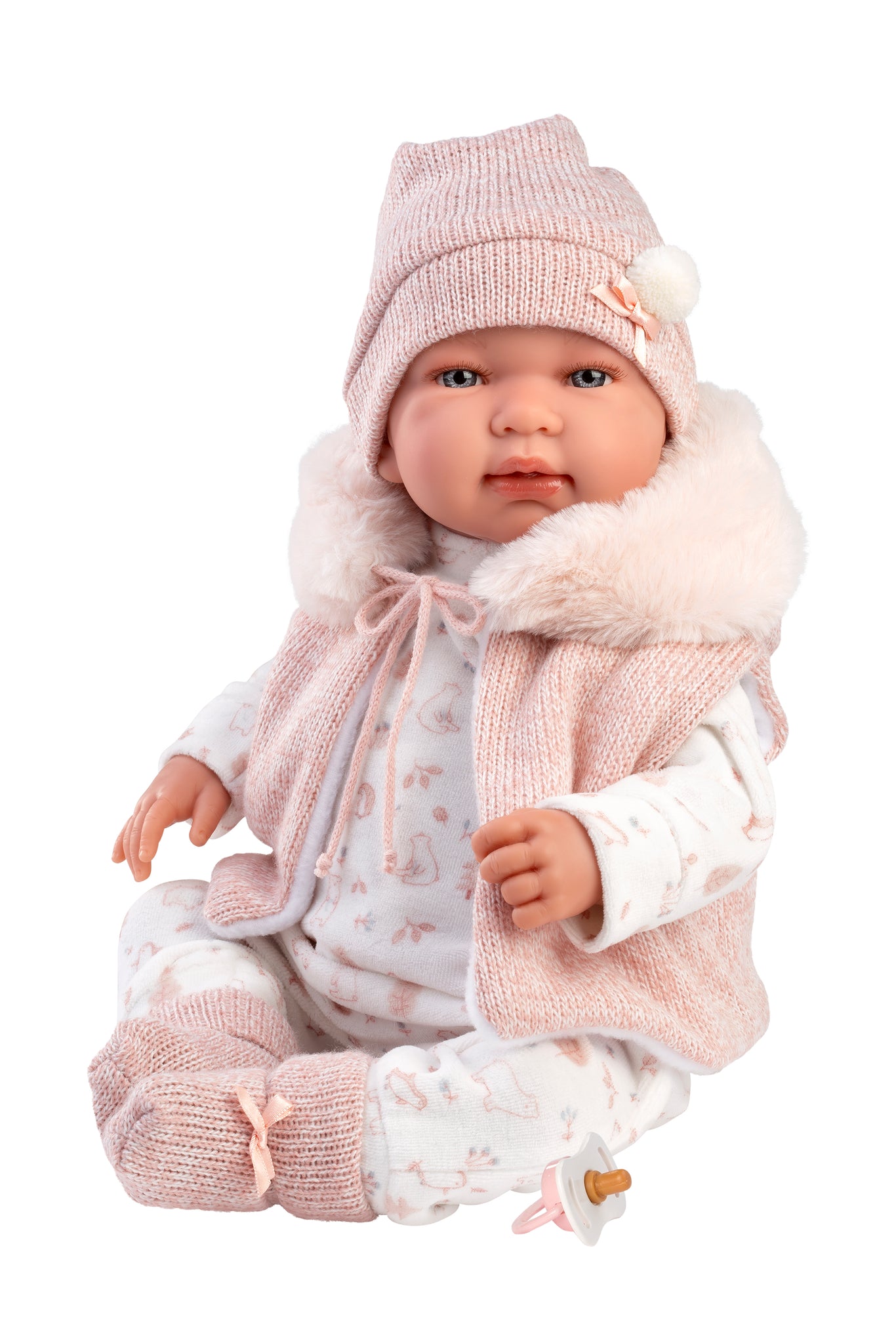 Meet Bella, the Llorens 17.3" Articulated Newborn Doll, dressed in cozy white print pajamas topped with a snug pink knit hooded vest, matching hat, and booties. Her flexible joints invite endless cuddles and playful adventures, making her the perfect companion for imaginative fun and heartwarming moments.