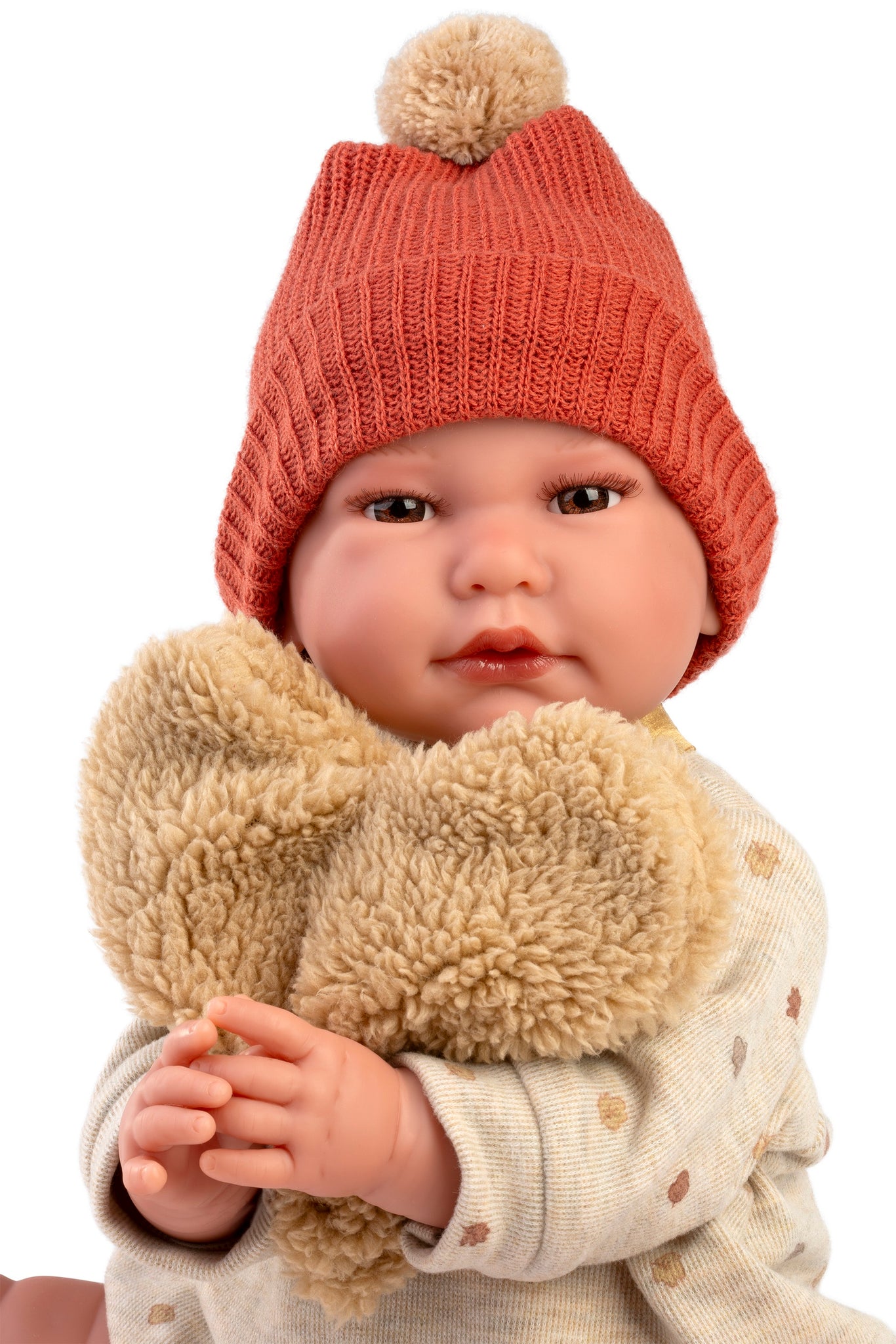Dress up for fall fun with the Llorens 17.7" Articulated Newborn Doll Miguel, cozy in a brown leaf print onesie complete with a matching hat and booties. This adorable doll comes with a soft heart-shaped pillow, perfect for cuddling during storytime or naptime. A sweet companion ready to join every autumn adventure!