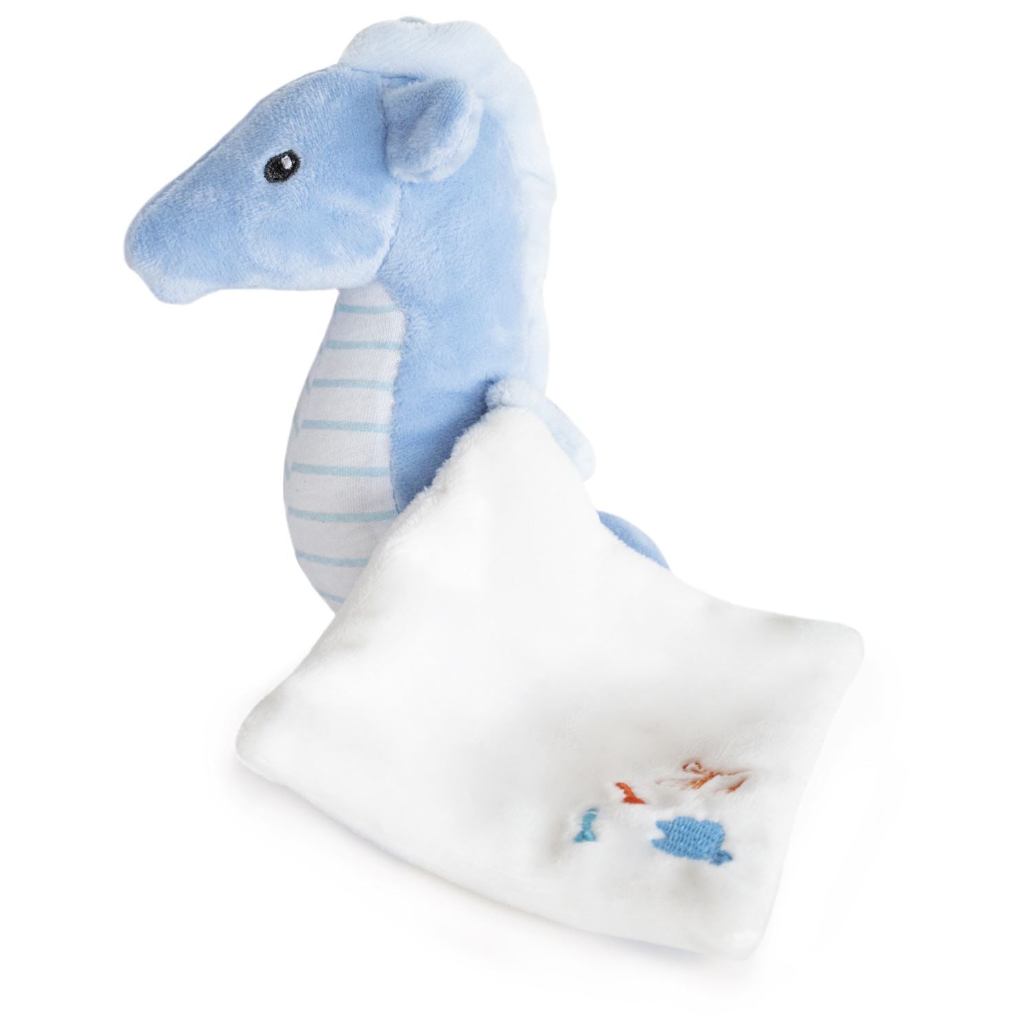 Adorable Blue Seahorse has a blue striped belly and holds a white Doudou blanket with embroidered sea shell and fish.